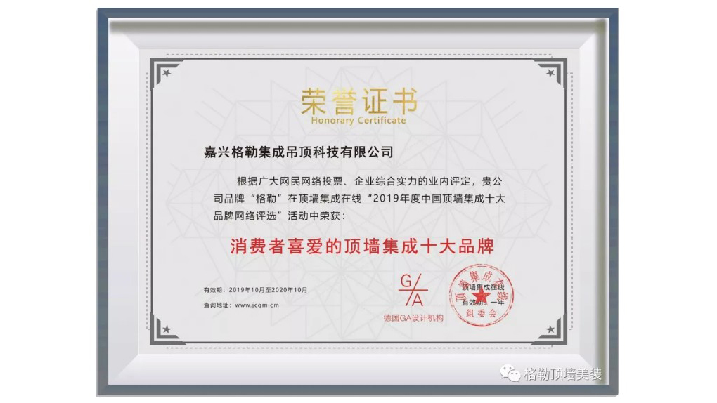 恭賀格勒吊頂蟬聯(lián)“消費(fèi)者喜愛的頂墻集成十大品牌”榮譽(yù)!