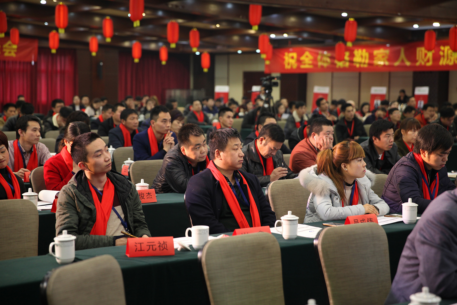上午八點(diǎn),格勒人列隊(duì)等候在酒店二樓會(huì)議廳門口,歡迎經(jīng)銷商家人們?nèi)雸?chǎng)。屋外寒風(fēng)冷冽,格勒人貼心地為家人們圍上大紅色圍巾抵御寒冷,同時(shí)也寓意著經(jīng)銷商生意越來(lái)越紅火!不僅如此,新年伊始,每個(gè)經(jīng)銷商家人還錄了一段新年祝福視頻,祝愿格勒全屋吊頂越辦越好!