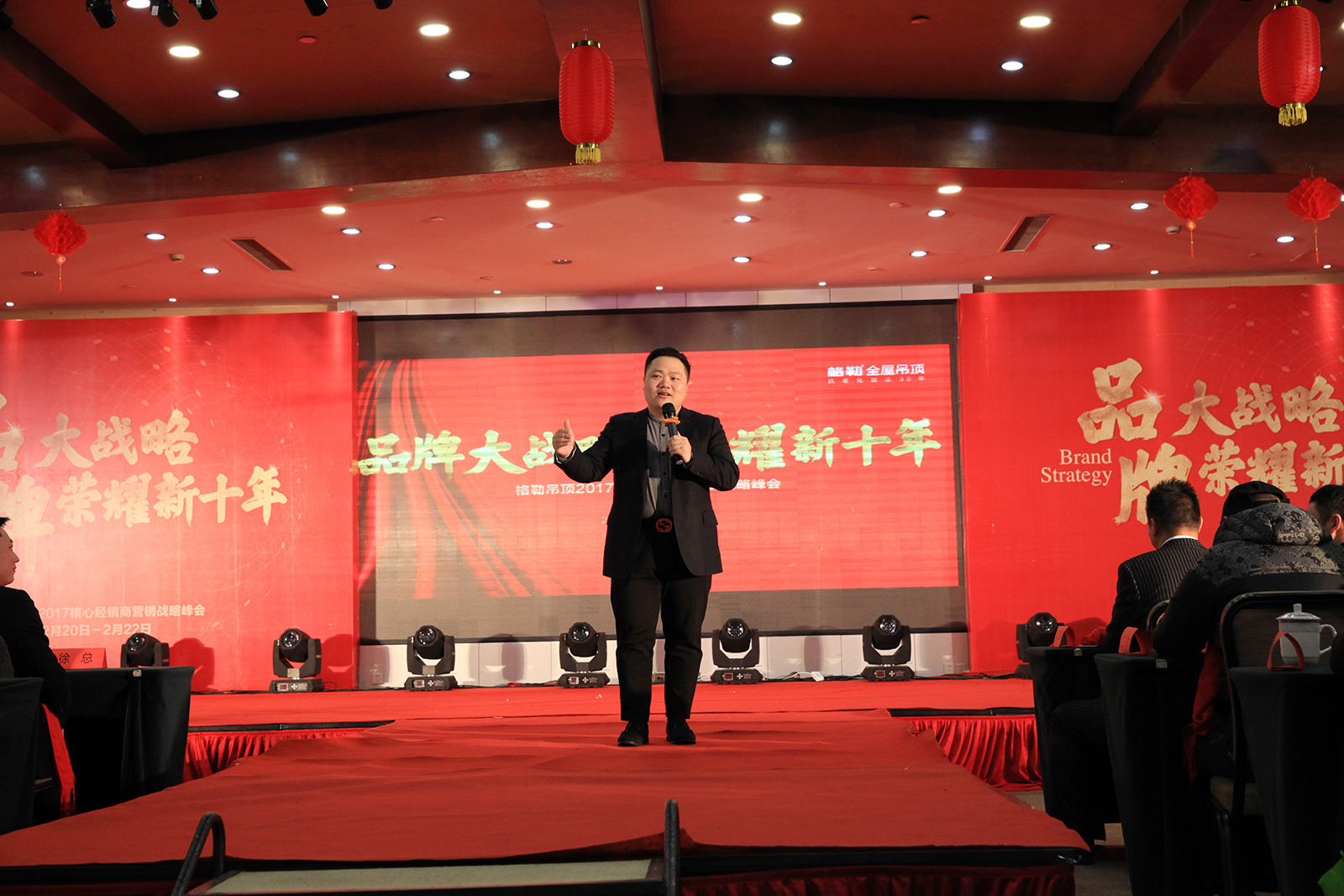 在經(jīng)銷商家人們?nèi)咳胱?,?huì)議正式開(kāi)始。格勒全屋吊頂已經(jīng)發(fā)展十年,對(duì)于未來(lái)十年的發(fā)展,又是如何規(guī)劃的呢?首先,由格勒全屋吊頂總經(jīng)理徐惠峰先生上臺(tái)給大家講述2017年整體戰(zhàn)略部署。2017年,是格勒全屋吊頂?shù)摹捌放颇辍保谄放茟?zhàn)略方面有了很多的提升,包括簽約形象代言人,終端服務(wù)、培訓(xùn)細(xì)節(jié)的加大,廣告語(yǔ)和logo的提升及廣告全方位覆蓋,新增網(wǎng)點(diǎn)500家,電器產(chǎn)品“質(zhì)”的飛躍等等,正式開(kāi)啟格勒全屋吊頂“品牌大戰(zhàn)略”。